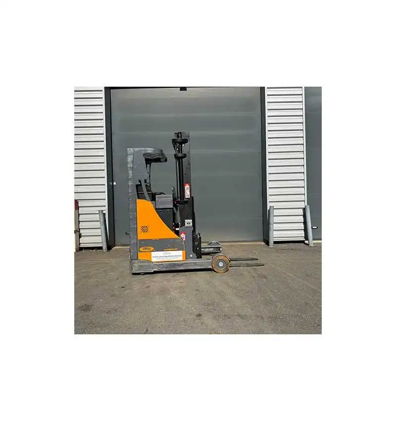 Chariot élévateur à mât rétractable d'occasion. Capacité de charge : 1 400 kg. Hauteur de levage : 5 200 mm. Batterie : 48V / 465Ah. Direction électrique 180° / 360°. Année : 2015. Horamètre : 1 448 heures. Garantie 6 mois.