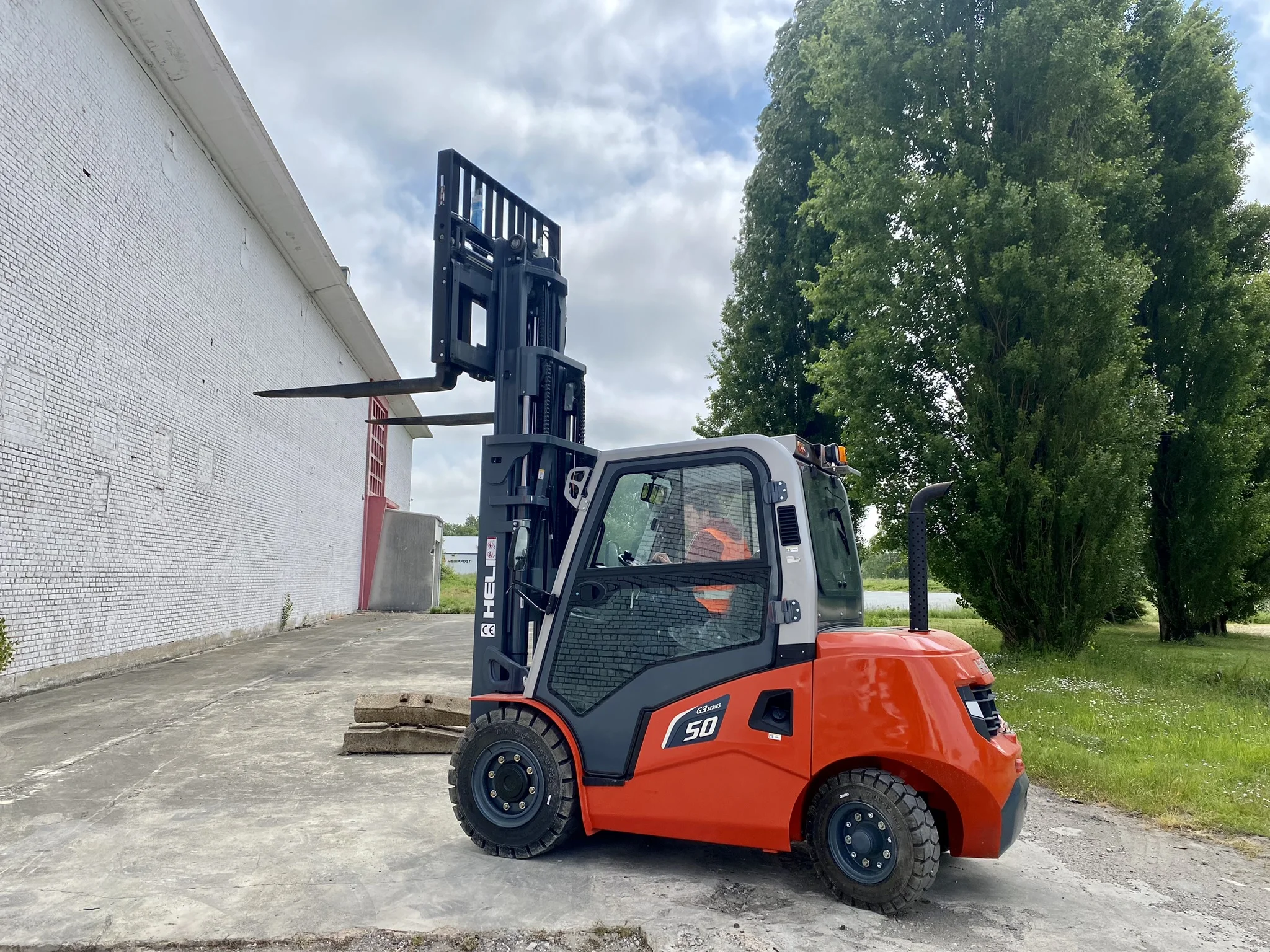 Chariot élévateur frontal thermique diesel HELI CPCD50-YC4G3 avec une capacité de charge de 5000 kg, à conducteur porté assis. Rayon de braquage de 3325 mm. Ce chariot élévateur frontal thermique peut atteindre une hauteur de levage max de 7000 mm, en mât triplex, avec grande levée libre, avec une levée libre à 2085 mm. Vitesse de déplacement 31 km/h....