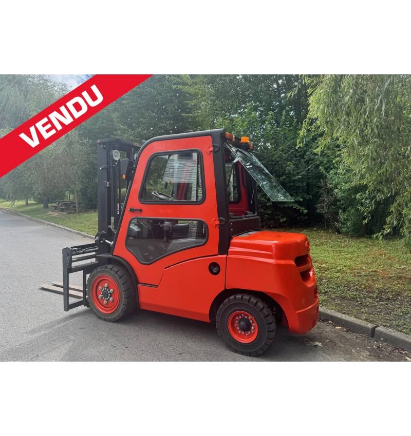 Chariot élévateur thermique diesel EP. Capacité de charge : 3 000 kg. Hauteur de levage : Mât triplex 4800 mm. Positionneur de fourches. TDL, tablier à déplacement latéral. Cabine avec chauffage. Année : 2019. Première main : 2183 heures. Garanti 1 an pièces ou 250 heures, le premier atteint.