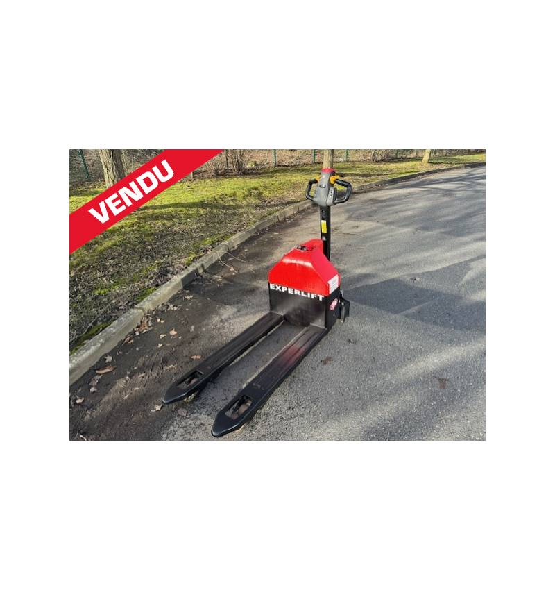 Transpalette électrique EP d'occasion. Capacité de charge : 1500 kg. Elévation : 120 mm. Fourches : 1150 mm. Batterie 24V / 85Ah. Chargeur intégré. Année 2018. Horamètre : 509 heures. Batterie neuve.