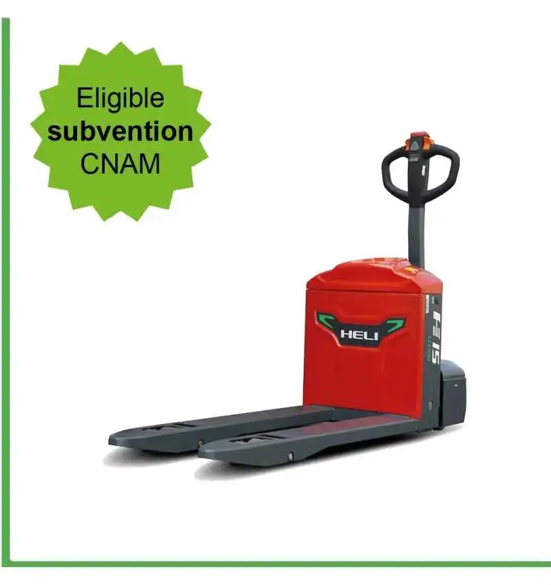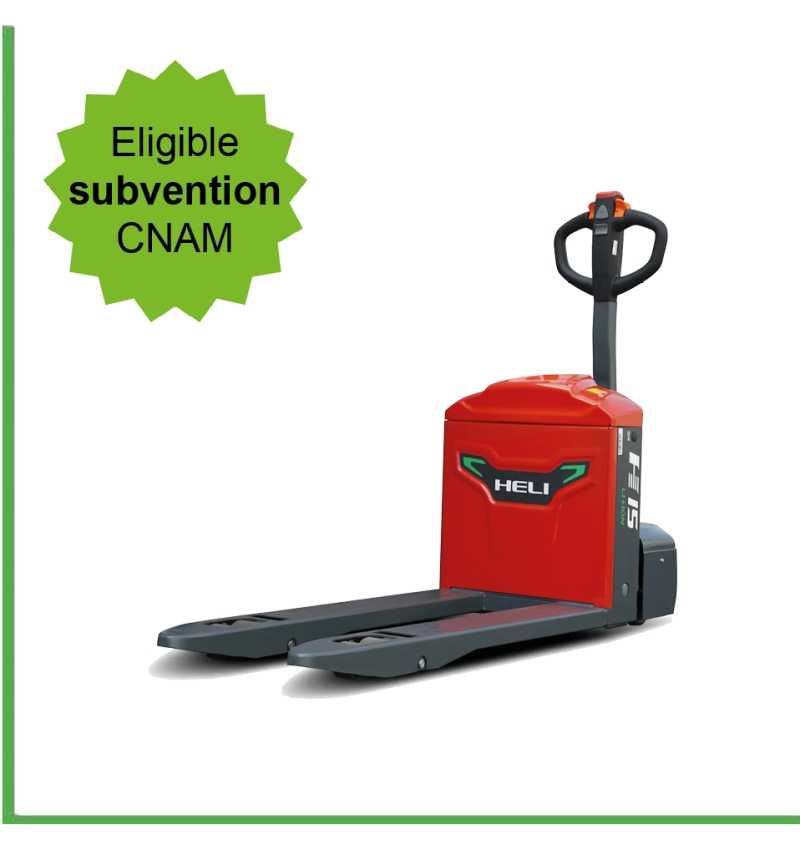 Transpalette électrique Lithium HELI CBD15-BLiH, simple, fiable et facile à manier. Transpalette Lithium avec capacité de charge de 1500 kg et hauteur de levage de 200 mm. Ce transpalette est votre allié pour les opérations dans les allées étroites. Rayon de braquage de 1370 mm. Il est conçu avec une batterie Lithium 24V / 40Ah. Vitesse de déplacement de 5 km/h. Poids du transpalette de 180 kg. Chargeur 24V / 15Ah. Batterie garantie 1 an. Ce matériel ne nécessite pas l’obtention du CACES.